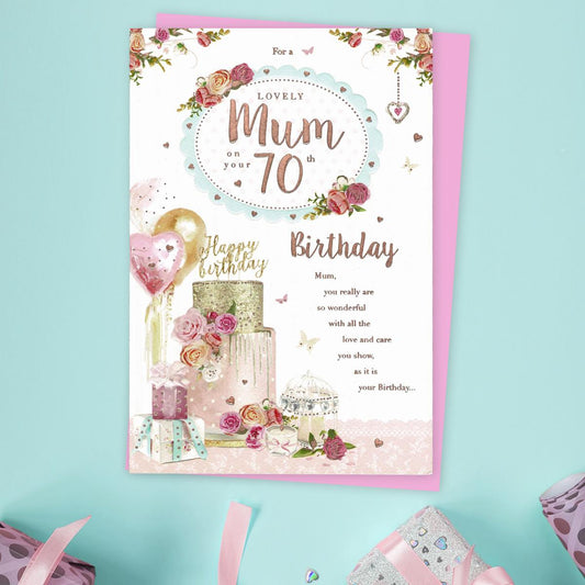 Mum 70th Birthday Card - Cake & Balloons