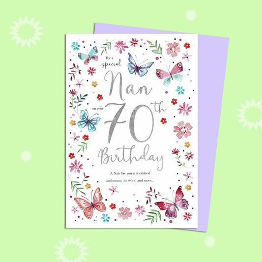 Nan 70th Birthday Card - Butterflies & Flowers