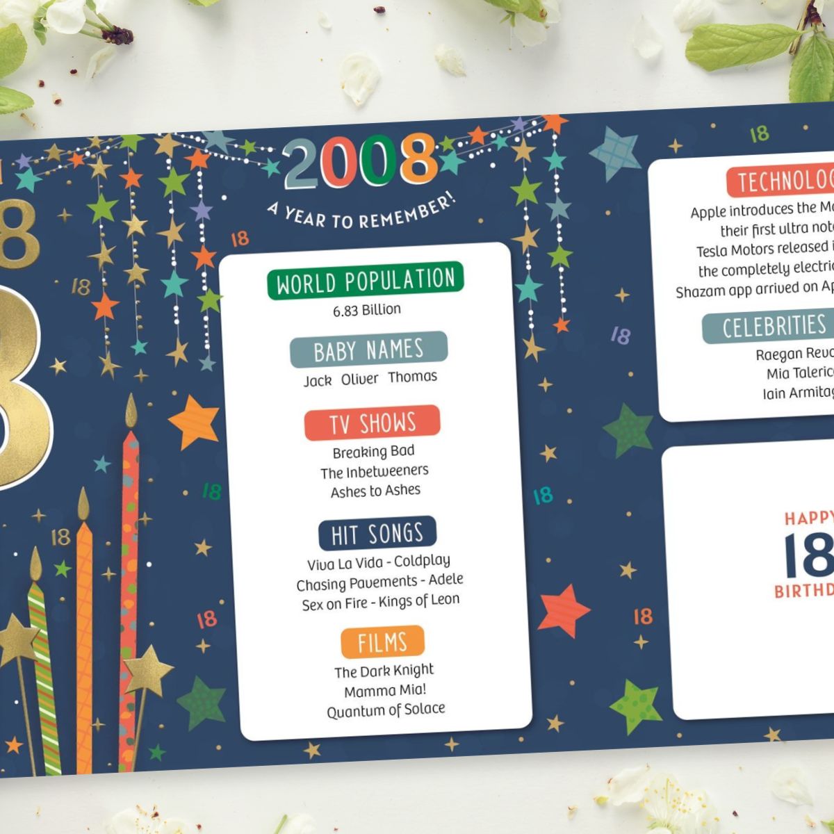 Stunning full colour 3-fold, embossed 18th Birthday card with gold foil details. Colour printed inside complete with fun facts about 2008.