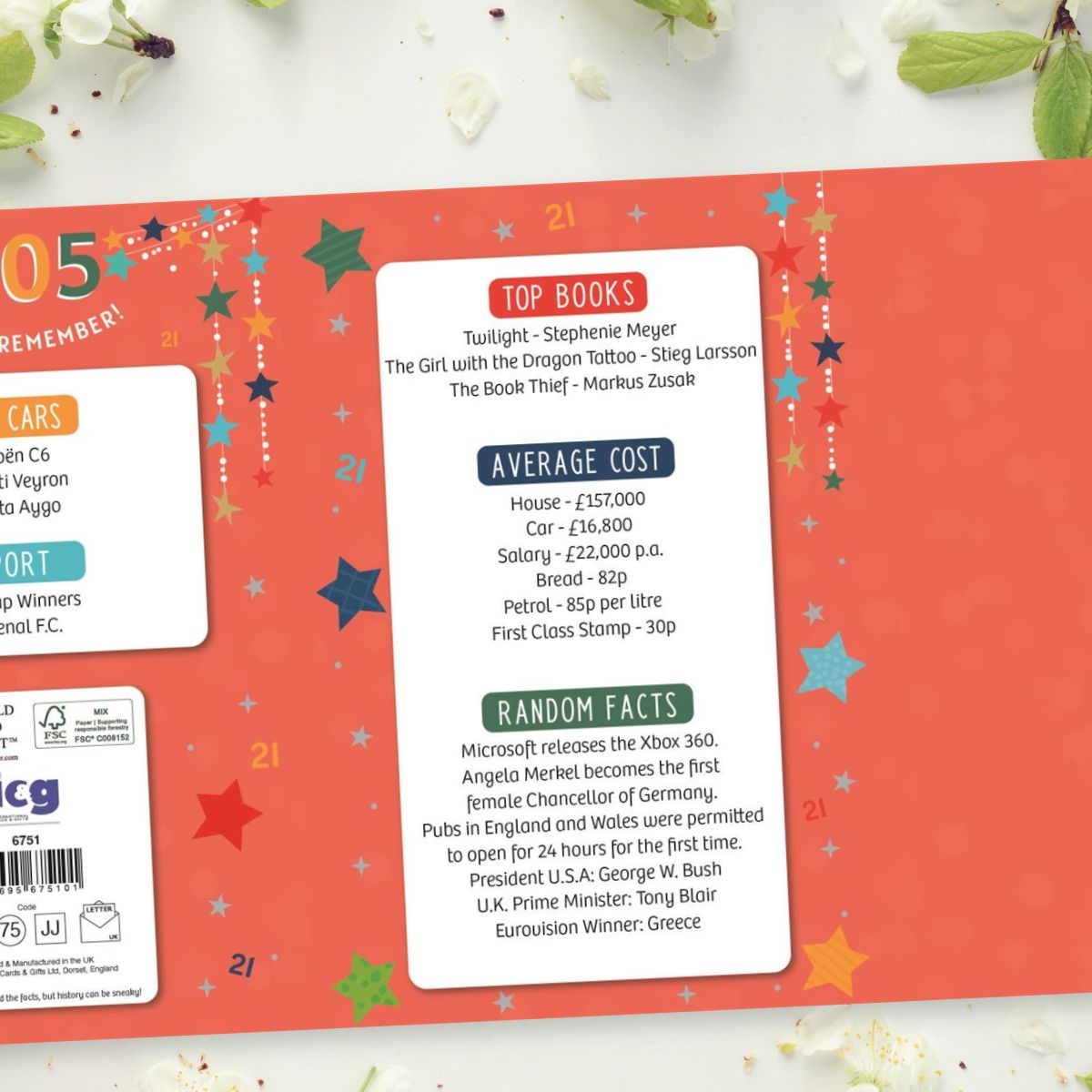 Stunning full colour 3-fold, embossed 21st Birthday card with silver foil details. Colour printed inside with fun facts about 2005.