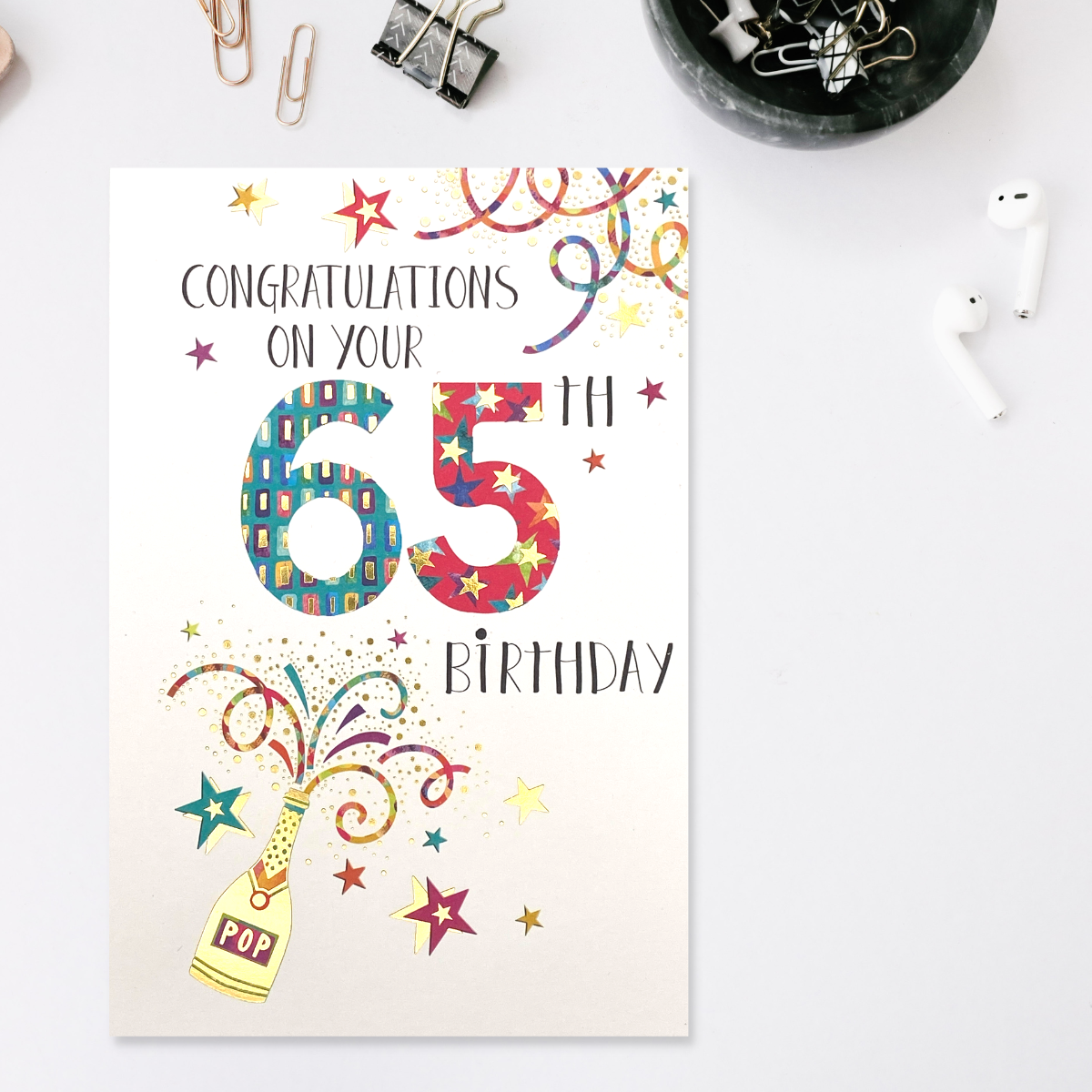 Fabulous full colour 65th Birthday card finished with gold foil details.