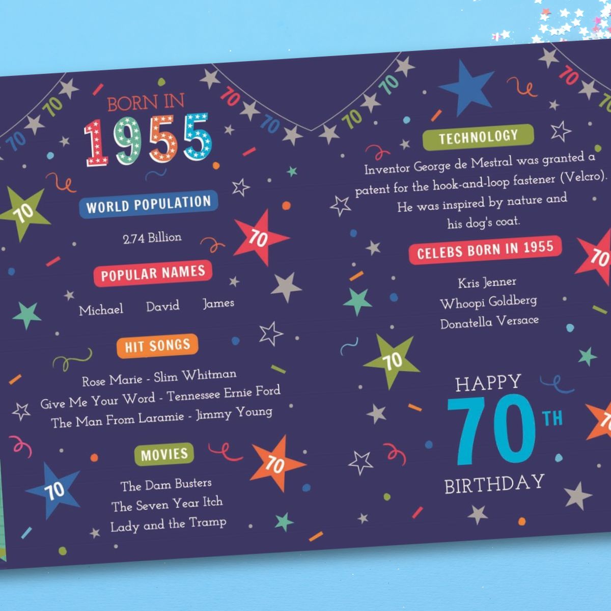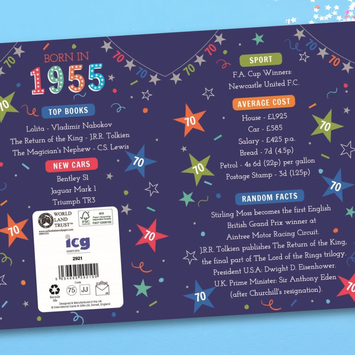 Stunning full colour 3-fold, embossed 70th Birthday card with gold foil details. Colour printed inside with fun facts about 1955.