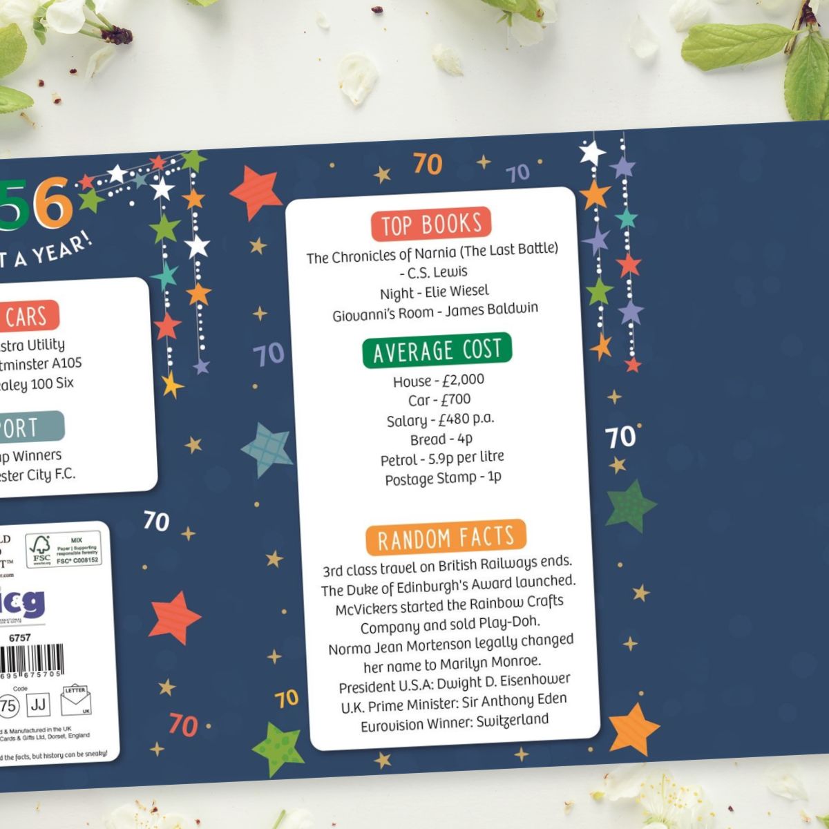 Stunning full colour 3-fold, embossed 70th Birthday card with gold foil details. Colour printed inside with fun facts about 1956.