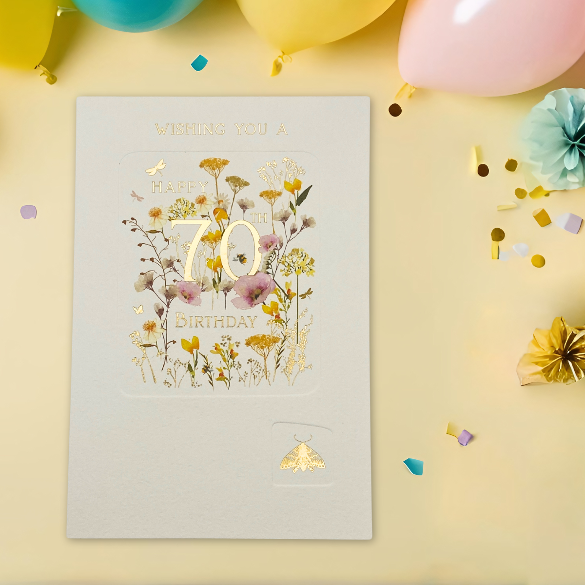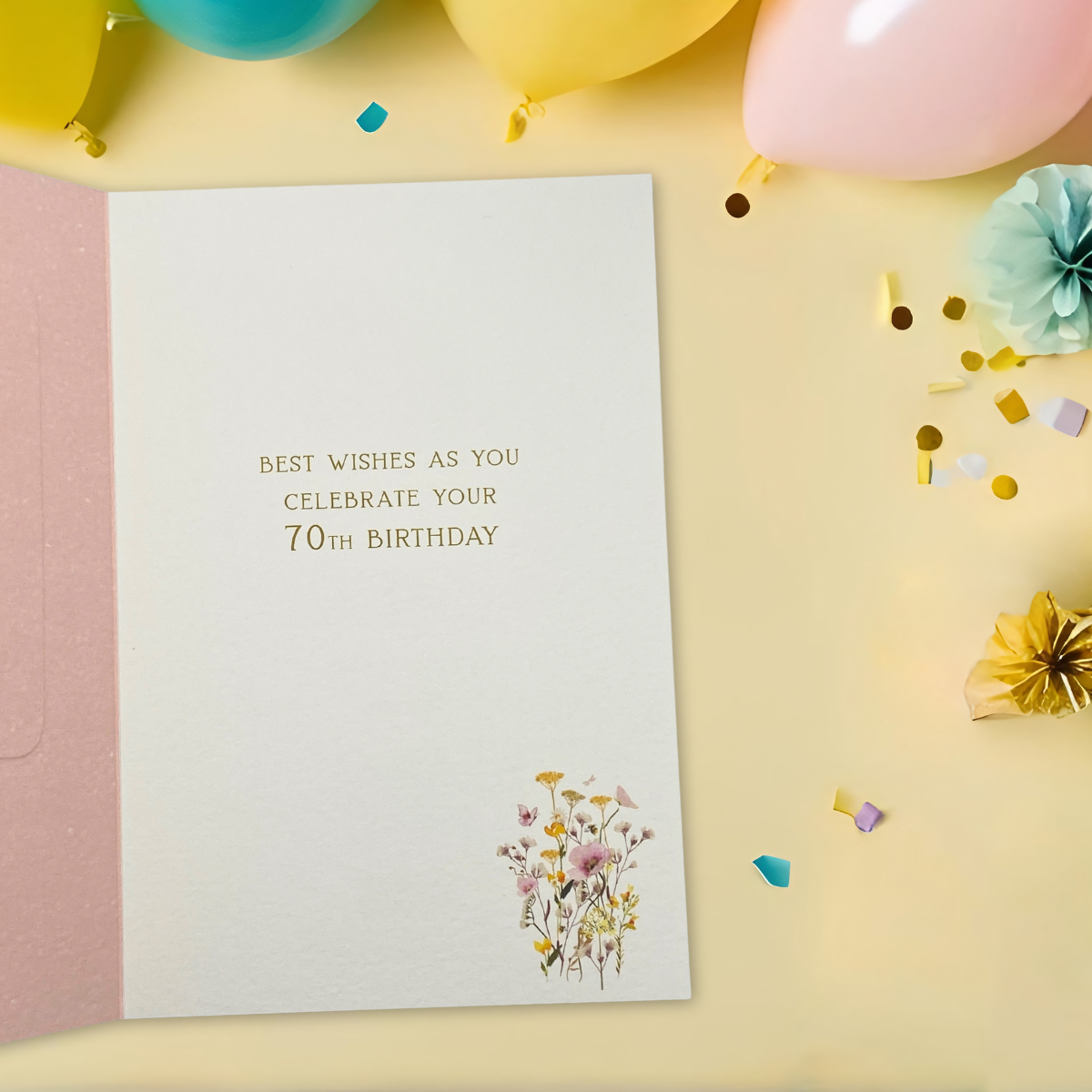 Fantastic full colour age 70 Birthday card with gold foil details and colour printed insert.
