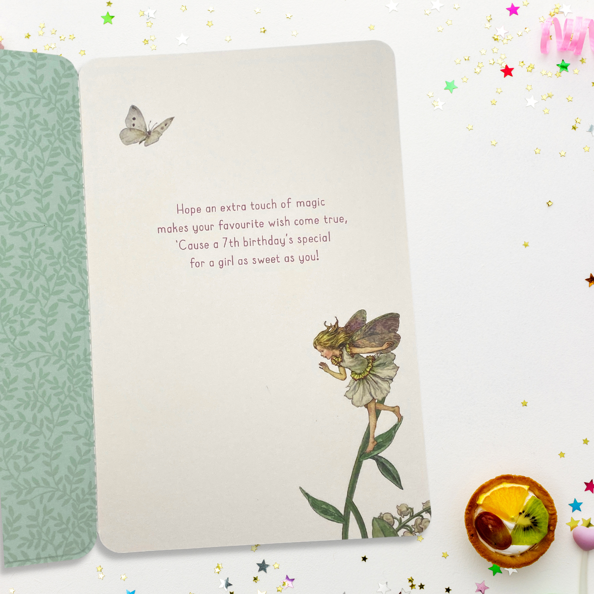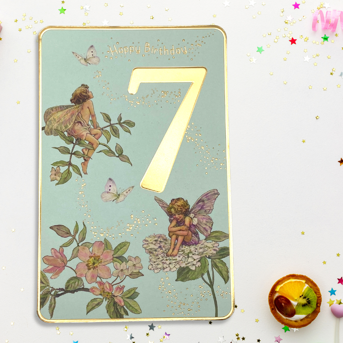 Fabulous full colour Age 7 Birthday card from the Flower Fairies collection with gold foil details and colour images inside.