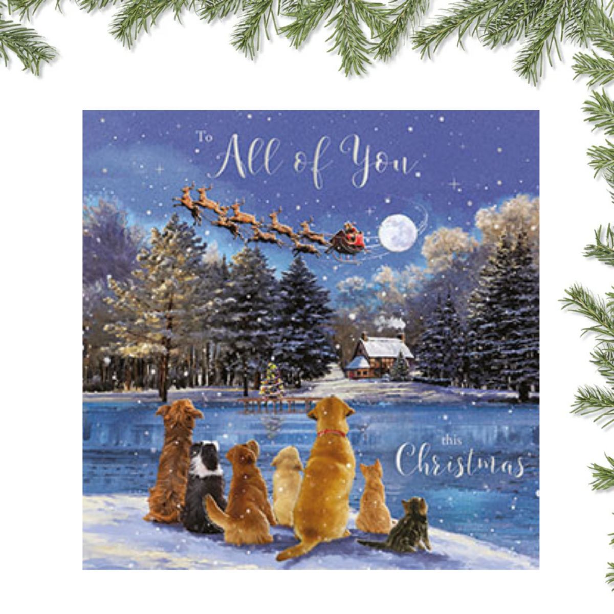 Fabulous All Of You Christmas design featuring dogs watching Santa flying his sleigh.