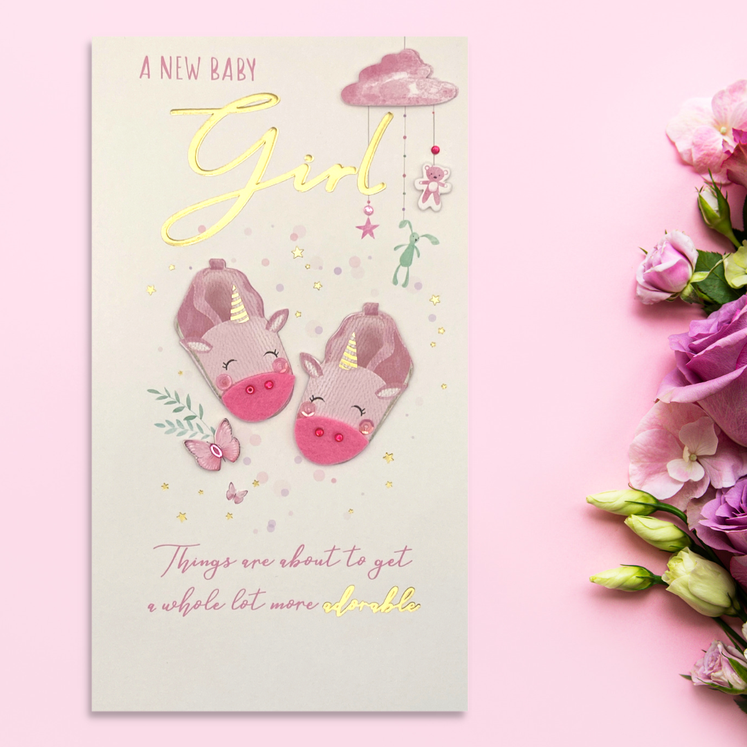 Fabulous full colour Baby Girl card from the Champagne collection with decoupage and sequin embellishments! Finished with gold foiling details and gold coloured envelope.