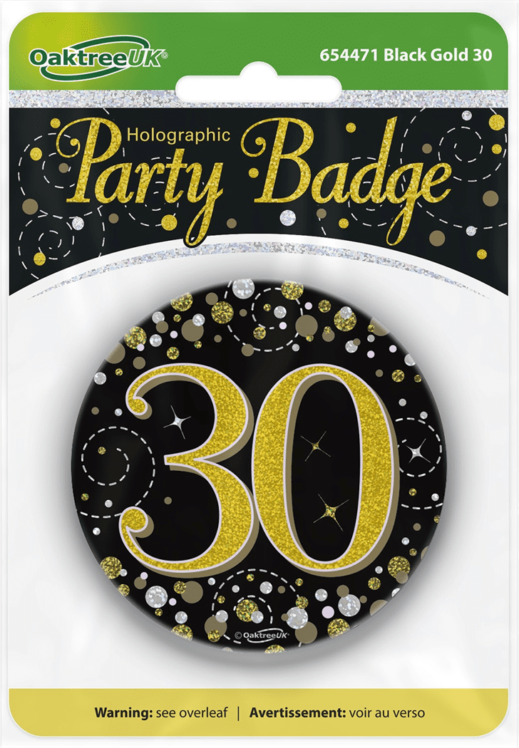 Black & Gold 3 inch holographic 30 Today badge with pin.