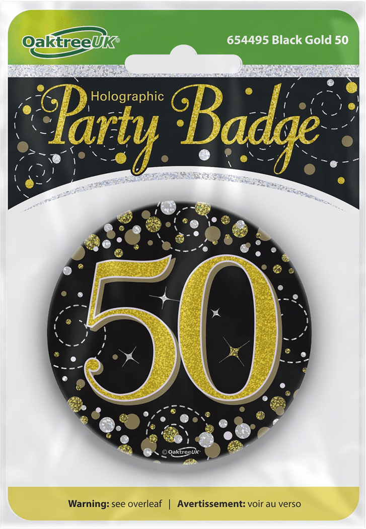 Black & Gold 3 inch holographic 50 Today badge with pin.