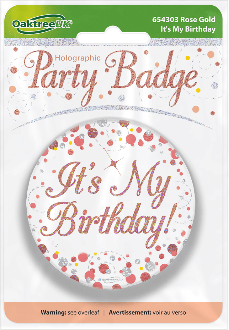 Rose Gold Sparkling Fizz 3 inch holographic It's My Birthday badge with pin.