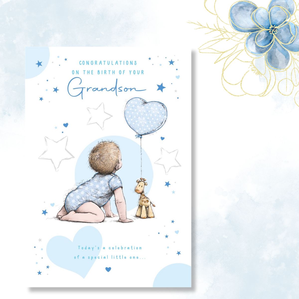 Stunning full colour Congratulations On The Birth Of Your Grandson card with blue foil accents and beautiful colour printed inside.