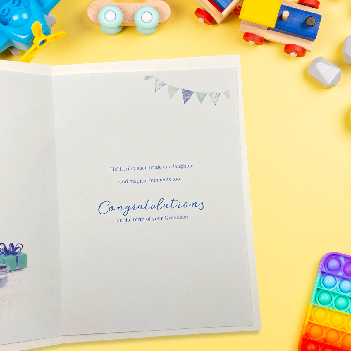 Fabulous full colour Birth Of Your Grandson card from the Essence collection. Finished with blue foiled accents, added sparkle and colour printed insert