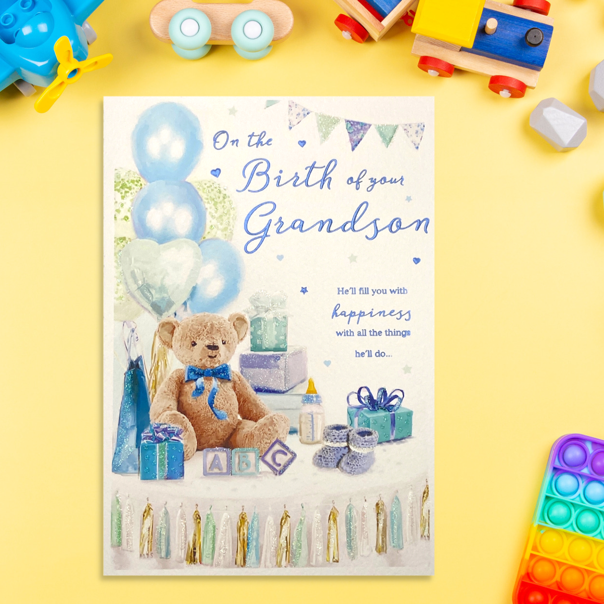 Birth Of Grandson Card - Essence Sparkle Teddy Bear & Balloons