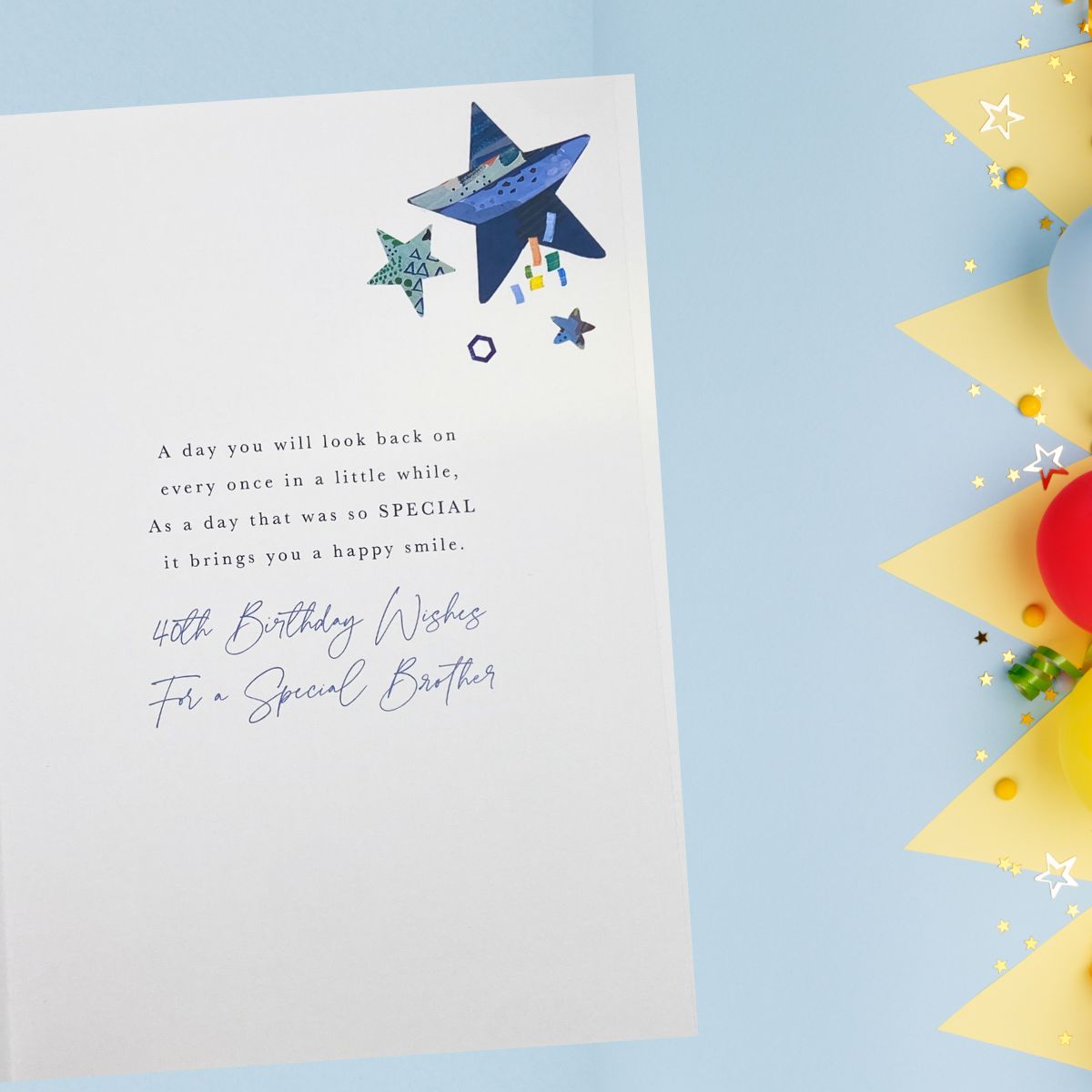 Stunning full colour Brother 40th birthday card complete with embossed lettering and printed insert.