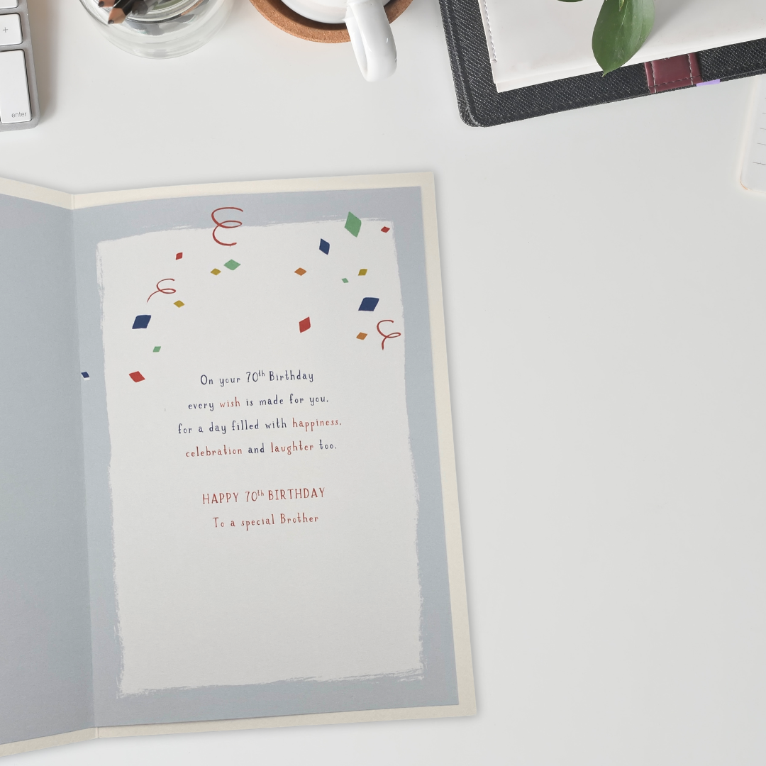 Stunning full colour Brother 70th birthday card complete with embossed lettering and printed insert.