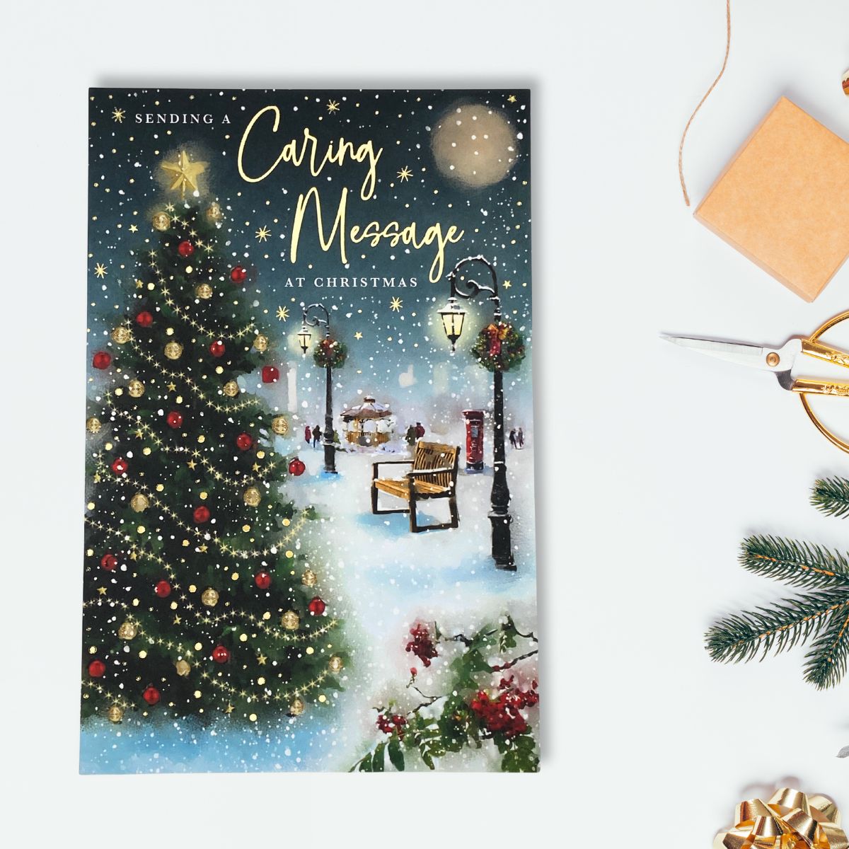 A beautiful Caring Message card at Christmas with gold foil details and colour printed inside.