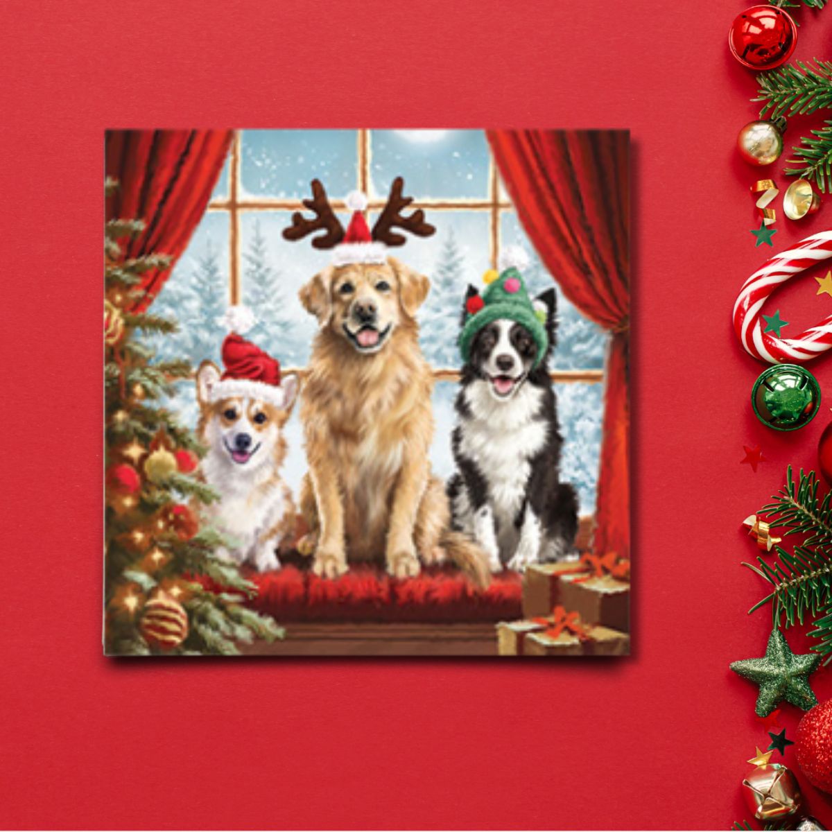 Fabulous Charity Christmas card pack by Noel Tatt featuring three festive hat wearing dogs. Eco-friendly, plastic free packaging.