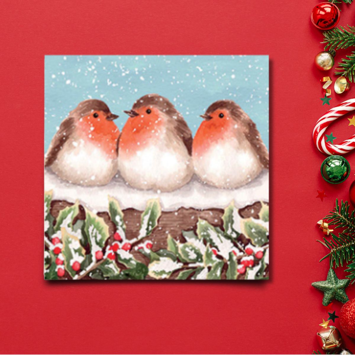 Fabulous Charity Christmas card pack by Noel Tatt featuring three beautiful red robins in the snow. Eco-friendly, plastic free packaging.