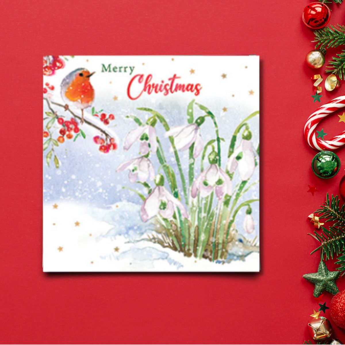 Fabulous Charity Christmas card pack by Noel Tatt featuring snowdrops and a red robin. Eco-friendly, plastic free packaging.