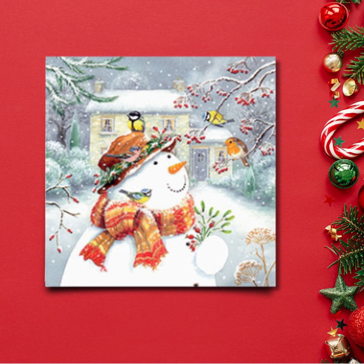 Fabulous Charity Christmas card pack by Noel Tatt featuring a snowman surrounded by beautiful birds. Eco-friendly, plastic free packaging.