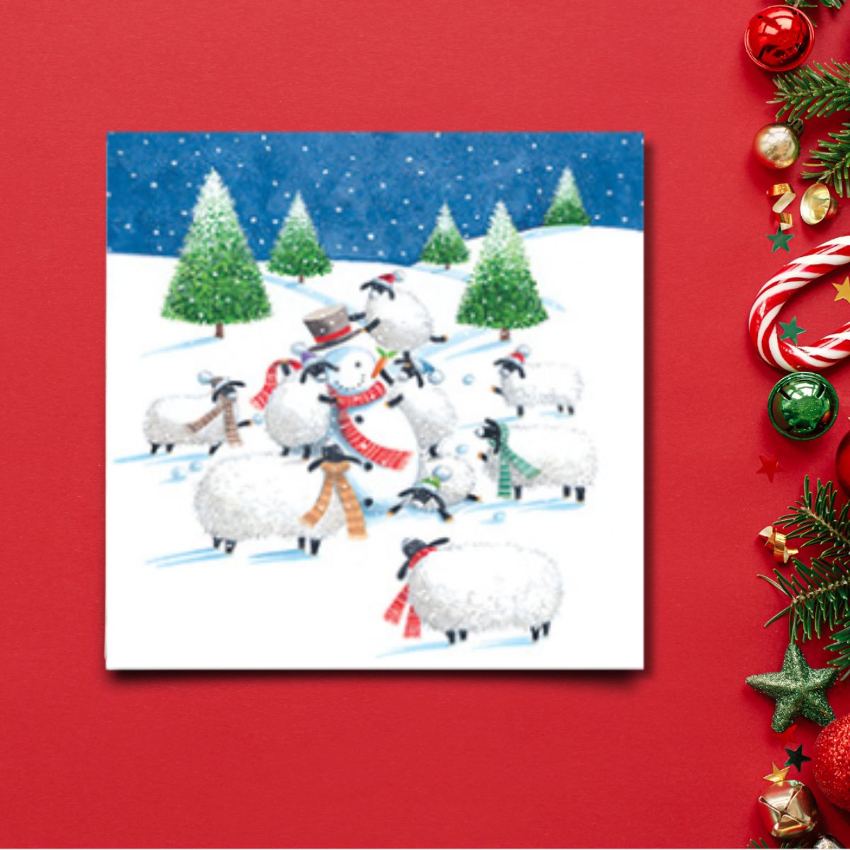 Fabulous Charity Christmas card pack by Noel Tatt featuring a snowman surrounded by sheep. Eco-friendly, plastic free packaging.