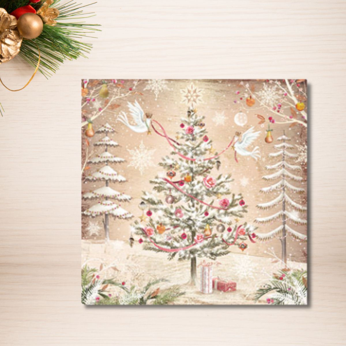 Fabulous Charity Christmas card pack by Noel Tatt featuring doves decorating the tree. Eco-friendly, plastic free packaging.