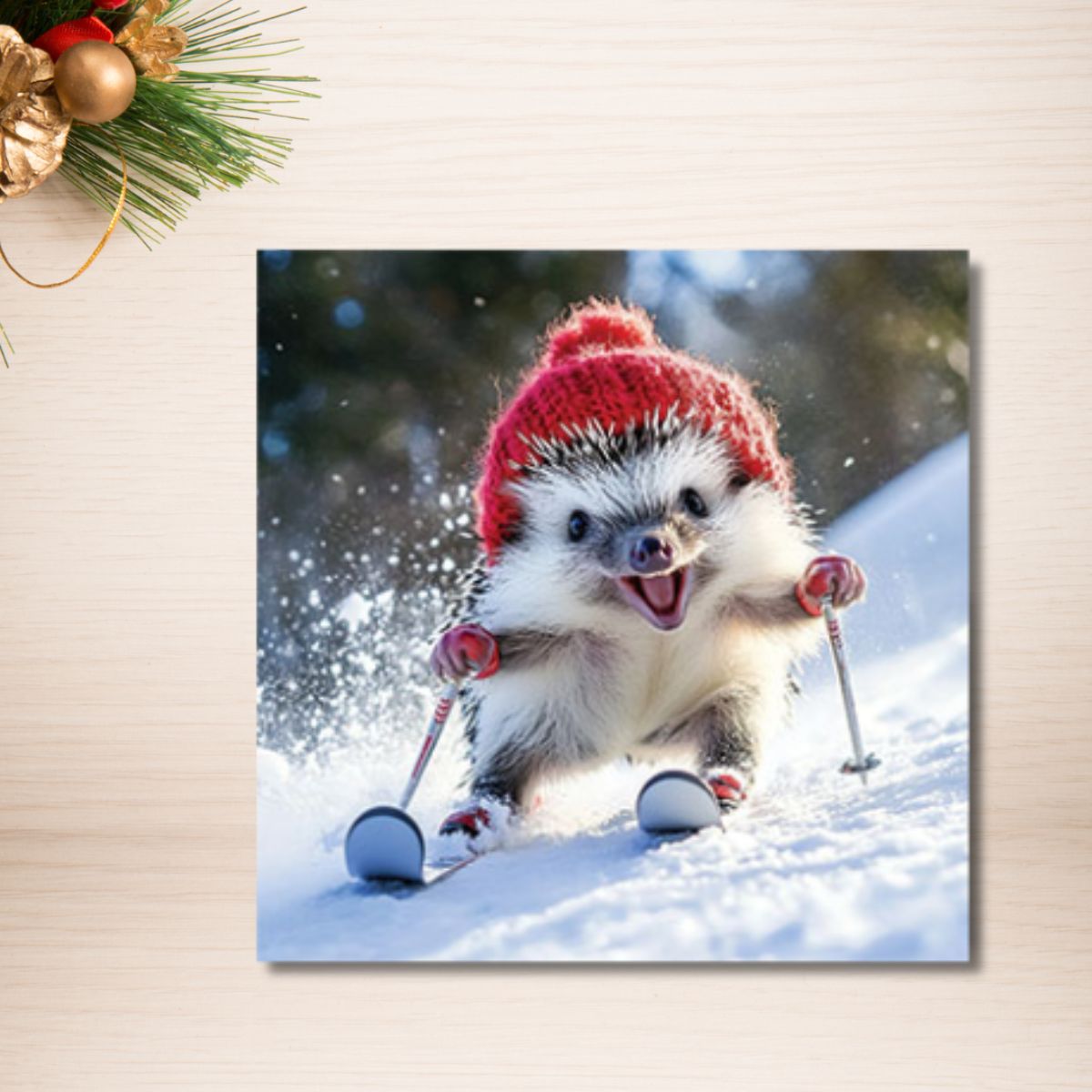 Fabulous Charity Christmas card pack by Noel Tatt featuring a skiing hedgehog. Eco-friendly, plastic free packaging.