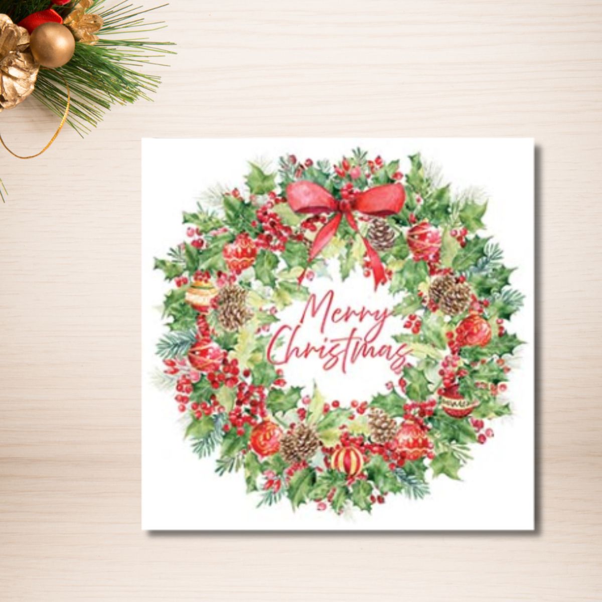 Fabulous Charity Christmas card pack by Noel Tatt featuring a beautiful Christmas wreath. Eco-friendly, plastic free packaging.