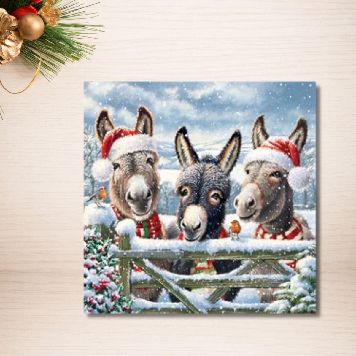 Fabulous Charity Christmas card pack by Noel Tatt featuring three donkeys in the snow. Eco-friendly, plastic free packaging.