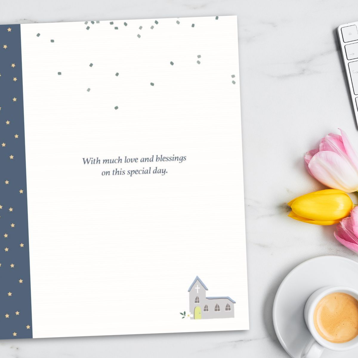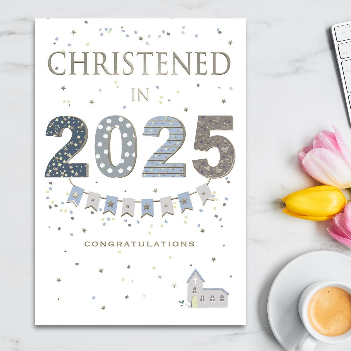 Stunning embossed Christened In 2025 card with silver foil details and colour printed insert!