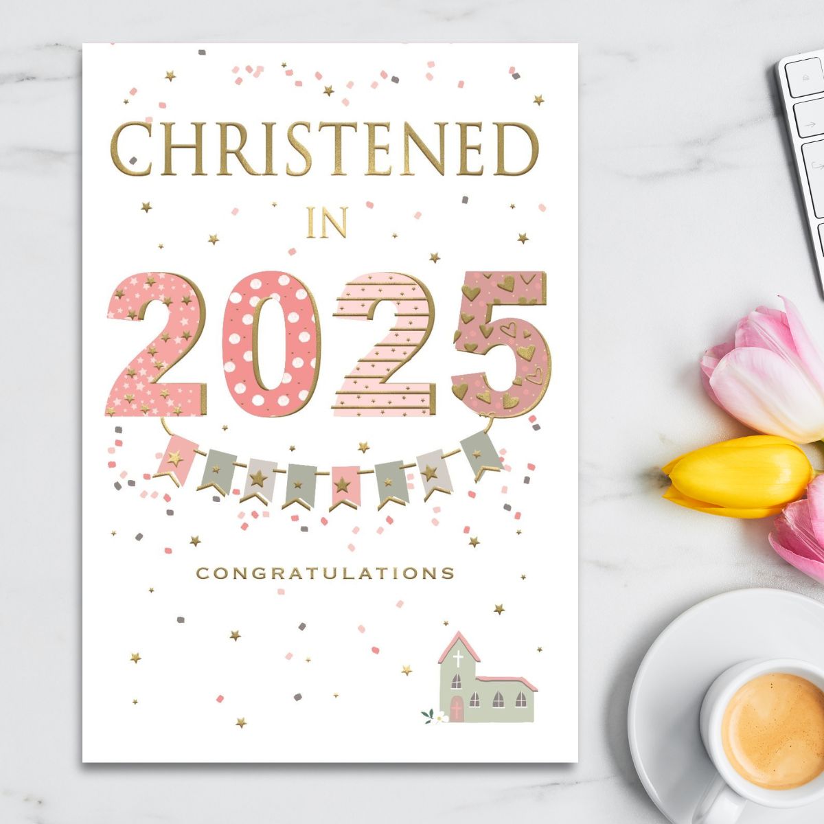 Stunning embossed Christened In 2025 card with gold foil details and colour printed insert!