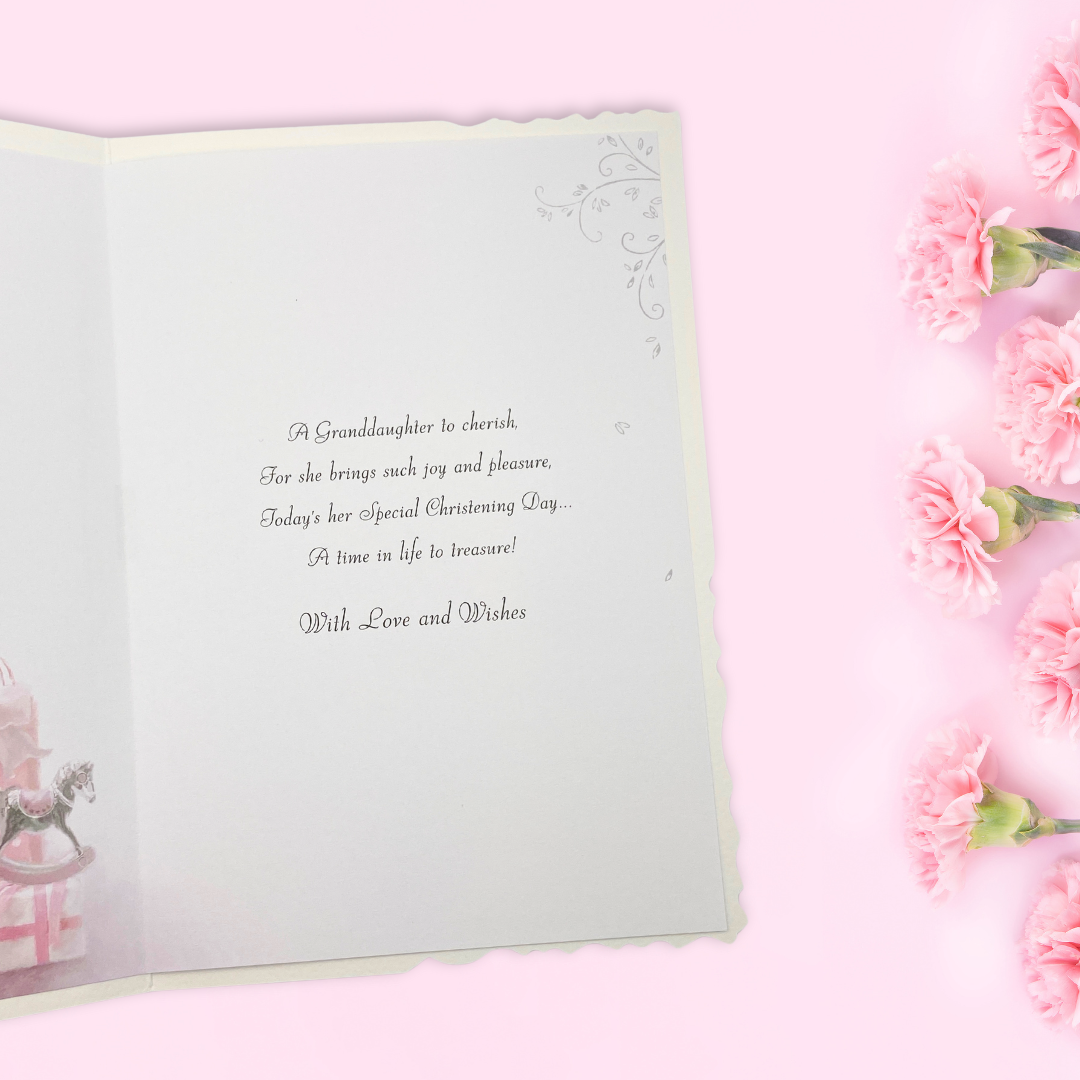 Stunning Granddaughter Christening Day card from the Velvet range. With silver foil details, added sparkle and colour printed insert.