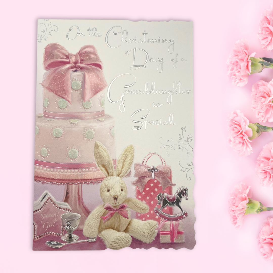 Christening Card Granddaughter - Velvet Sparkle Bunny & Cake