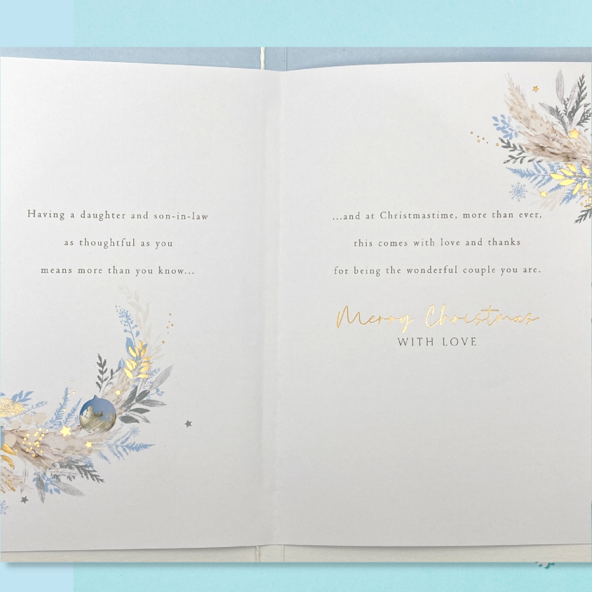 Beautiful full colour Daughter & Son-In-Law Christmas card with white tied embellishment, gold foil details and the prettiest colour printed insert.