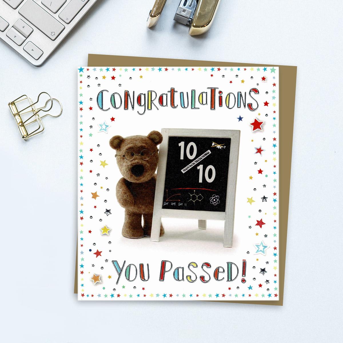 Colourful embossed Congratulations You Passed card featuring Barley Bear with silver foil detail and colour printed insert.
