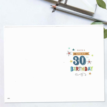 Fabulous full colour Dad 30th birthday card from the Giddy Up range with blue foil details and colour printed insert.
