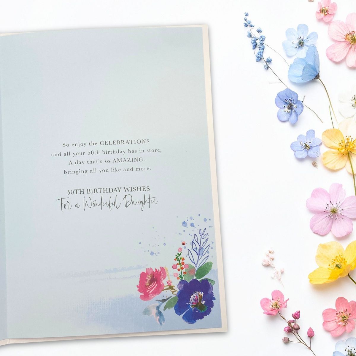 Gorgeous full colour Daughter Age 50 Birthday card with gold foil accents and colour printed insert.