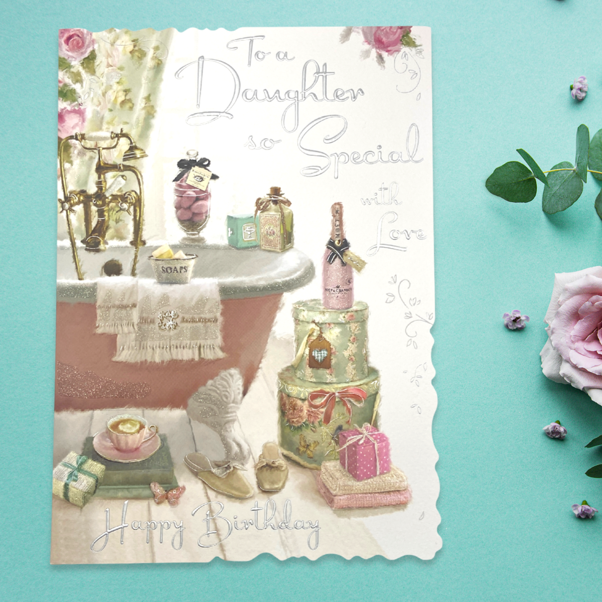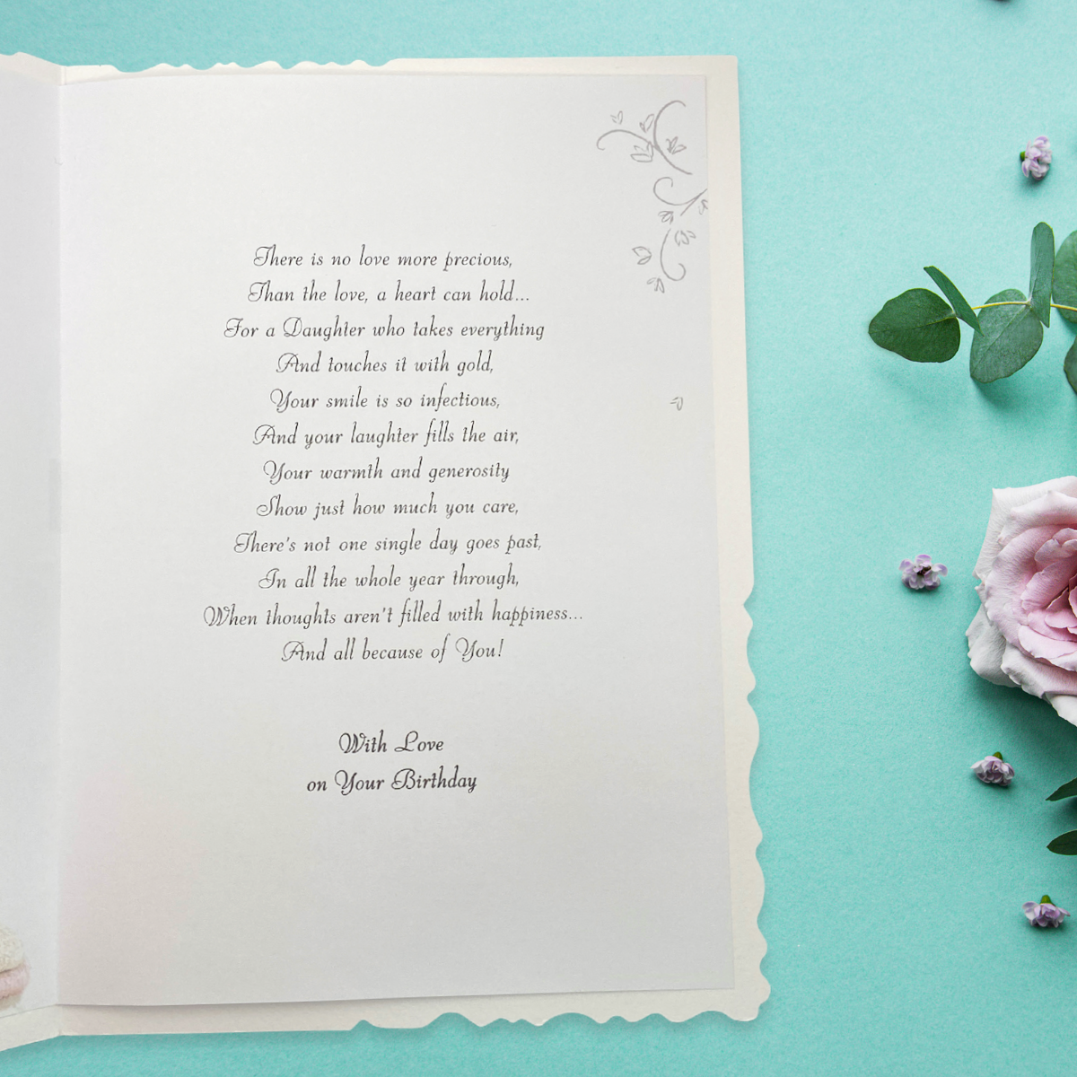 Stunning Daughter Birthday large card from the Velvet collection. With die-cut edge, textured effect and added sparkle. Finished with silver foiling accents and colour printed insert with heartfelt words.