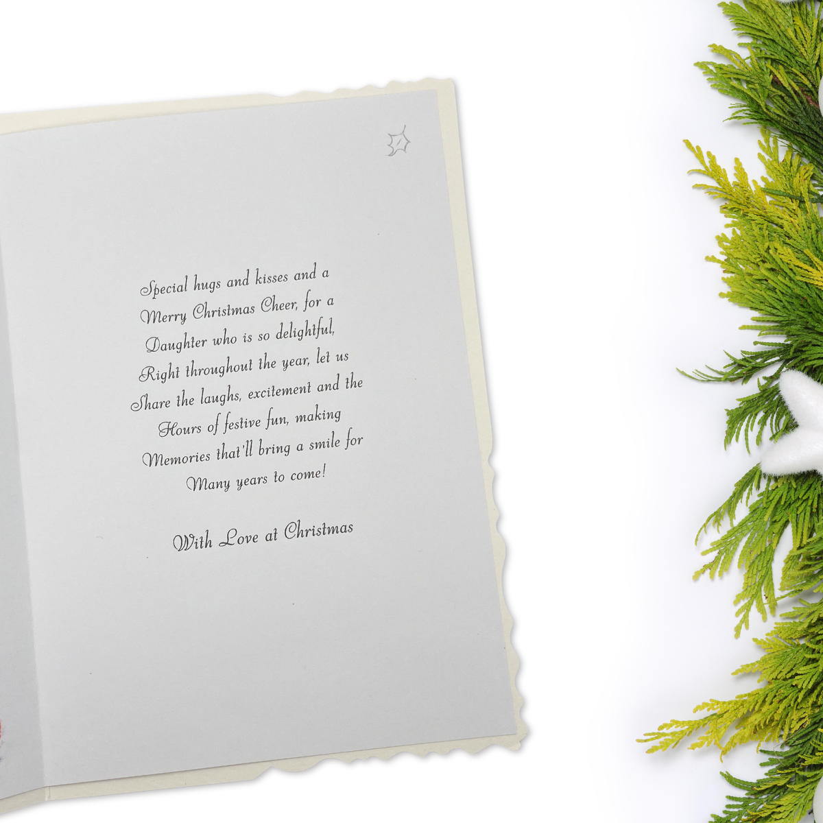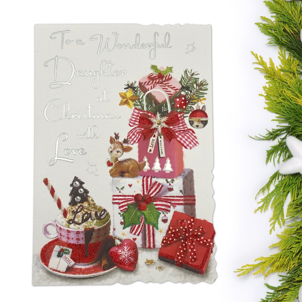 Gorgeous full colour Daughter Christmas card from the Velvet collection. Finished with silver foil accents, added sparkle and colour printed insert.