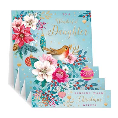 Eye catching Daughter Christmas card that stays flat for posting in the envelope and then ‘Pops Up’ when opened. These beautiful cards have a reverse panel for a personal message. A festive card just a little bit different and one that will certainly be remembered!