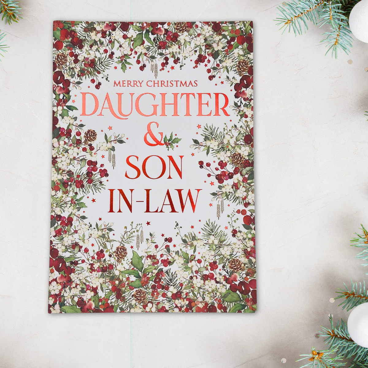 Fabulous full colour Daughter & Son-In-Law Christmas card with red foil details. Finished with colour print inside.