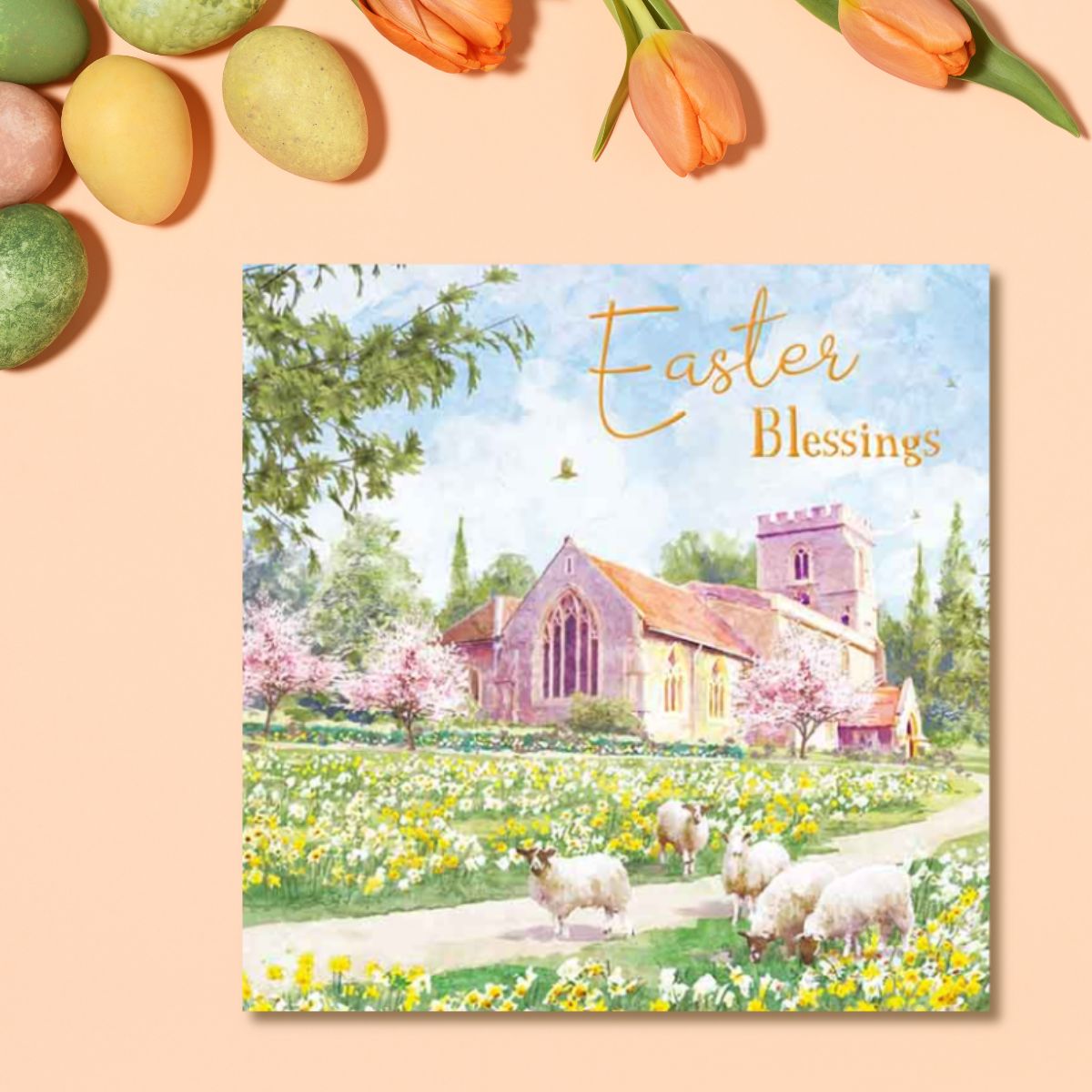 Pack Of 4 Beautiful Easter Cards featuring a church scene & sheep among daffodils. All cards of the same design. With yellow envelopes.