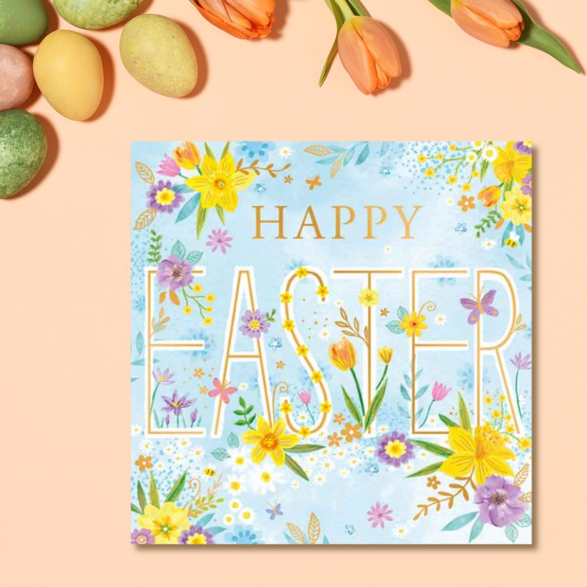 Pack of 4 beautiful Easter cards featuring floral text with daffodils. All cards of same design. With yellow envelopes.