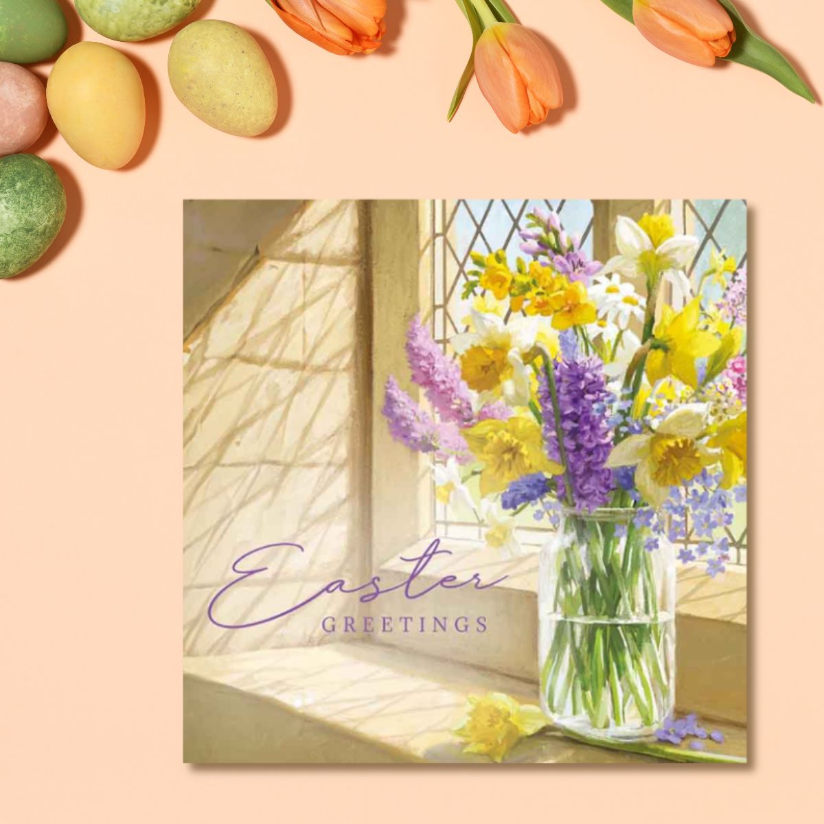 Pack Of 4 Beautiful Easter Cards featuring a a window sill with floral vase. All cards of the same design. With yellow envelopes.