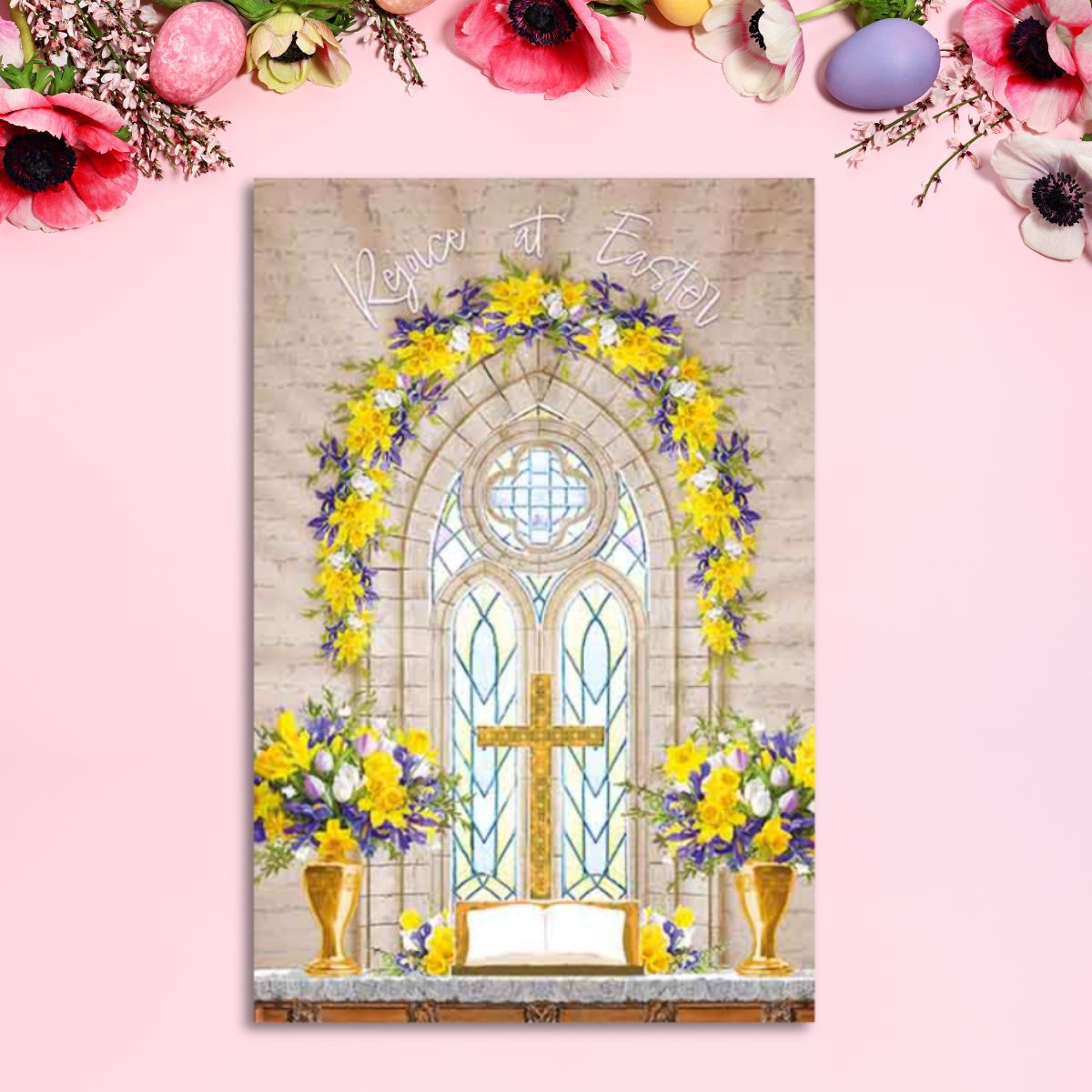 Pack Of 4 Beautiful Easter Cards featuring floral display next to a church window. All cards of the same design. With yellow envelopes.