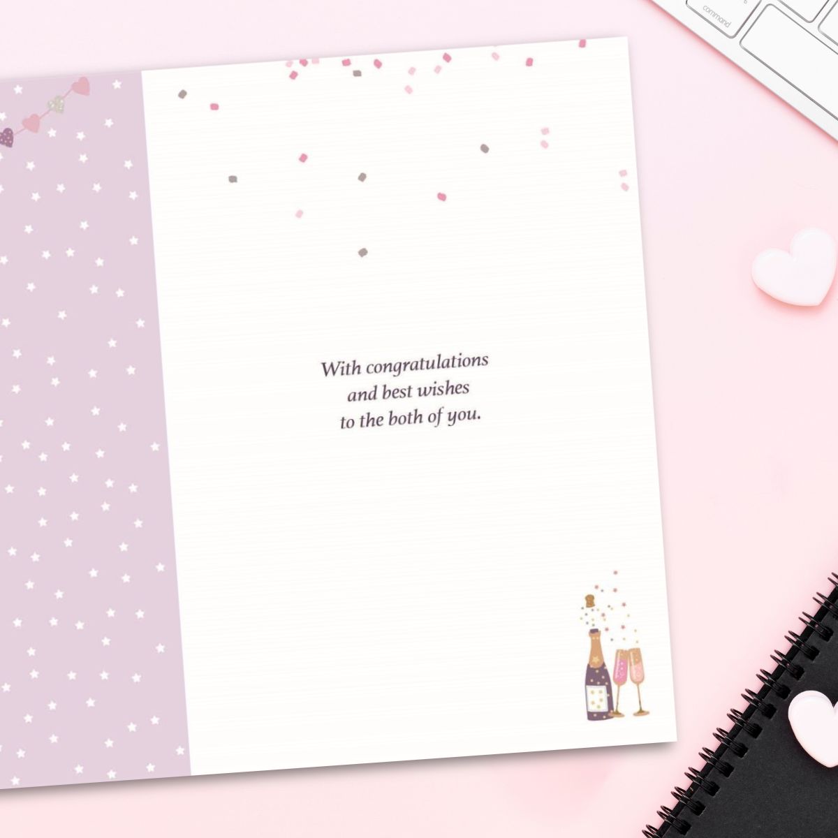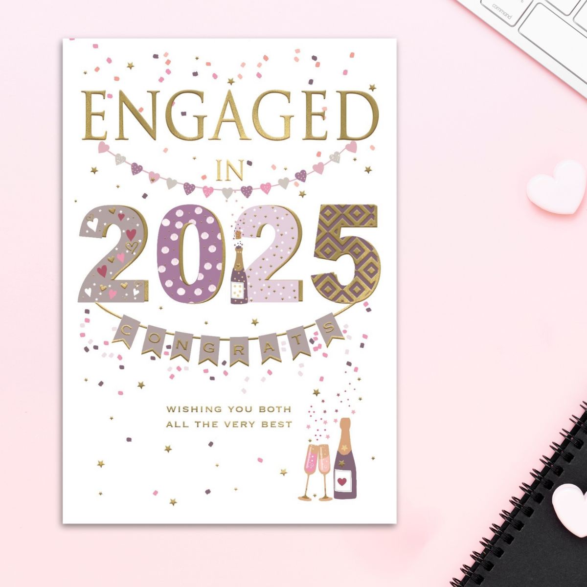 Stunning embossed Engaged in 2025 card with gold foiled details and colour printed insert.