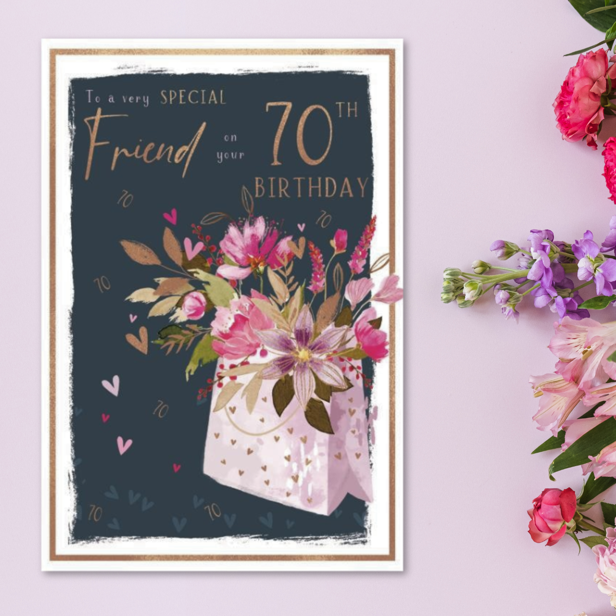Stunning full colour Friend 70th card complete with foiled lettering and printed insert.