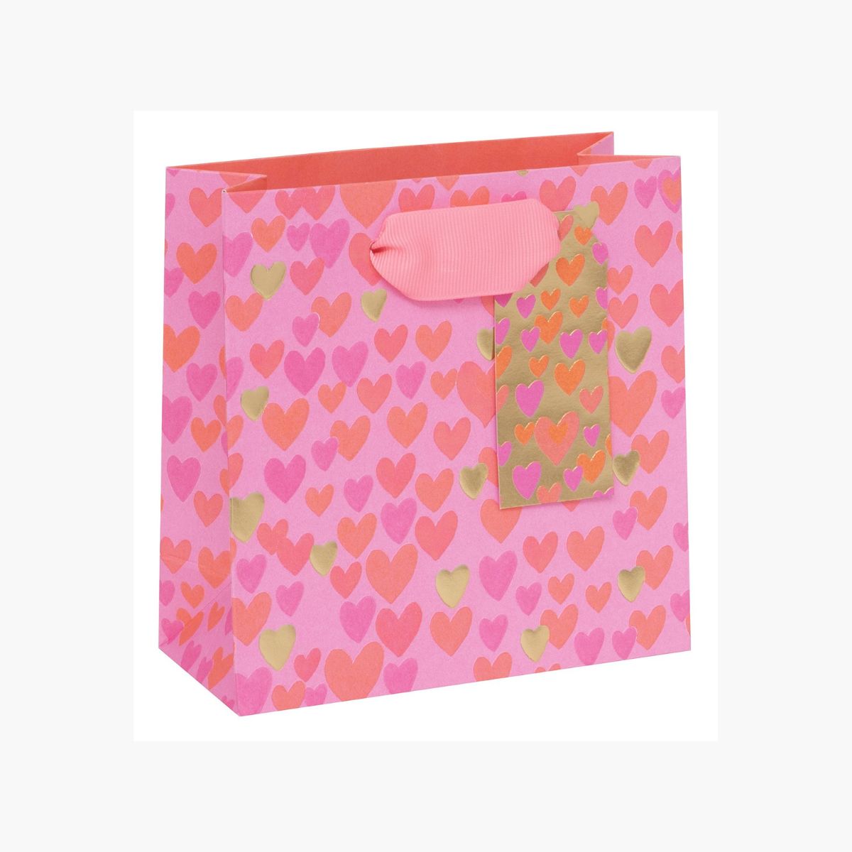 Fantastic small Gift Bag from the Paper Salad collection with Love Heart print. Finished with matching tag. Recyclable when ribbon handles are removed.