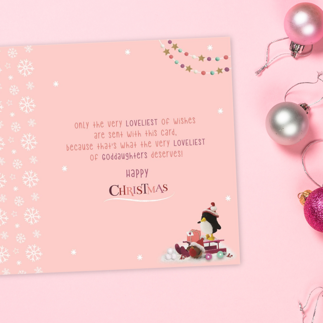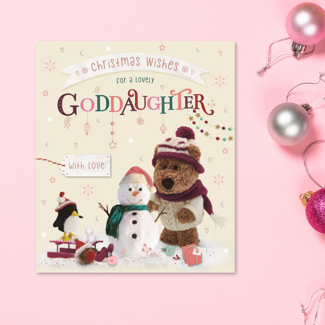 Fabulous full colour Goddaughter Christmas card featuring Barley Bear with beautiful colour printed inside.