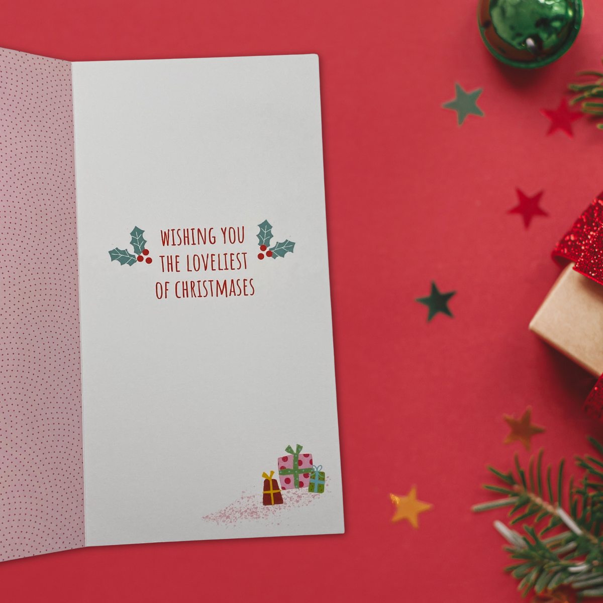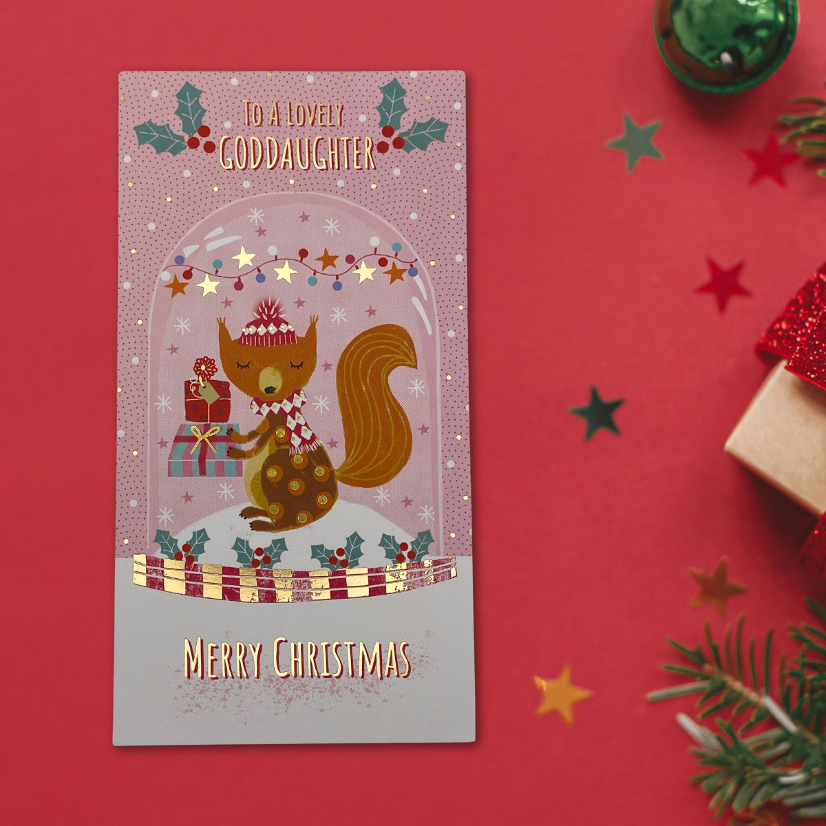 Fabulous Goddaughter Christmas card with gold foil details and colour printed inside.